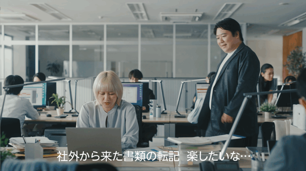 ラランドのお二人に、「社内ワークフローのムダを見つける」「社外から受け付けた書類の転記」といった社内の光景をコミカルに演じていただきました。