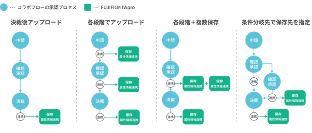 - コラボフローからFUJIFILM IWproのドキュメントにアップロードする際に、コラボフローの申請データをアップロードするドキュメントの属性情報として連携する。